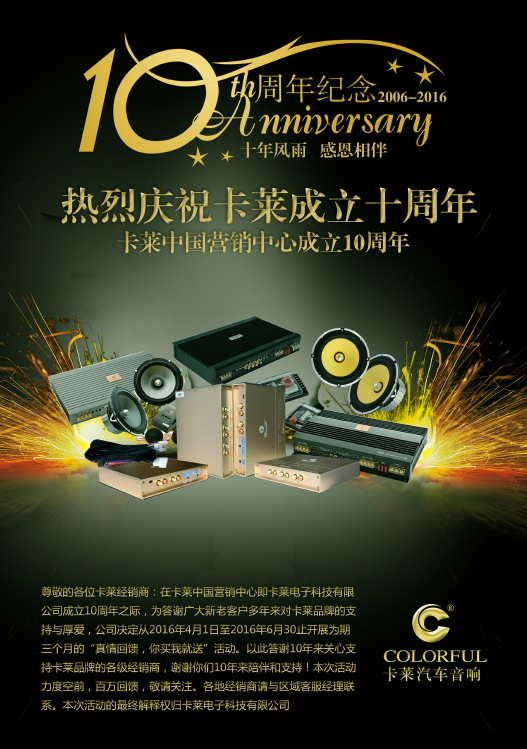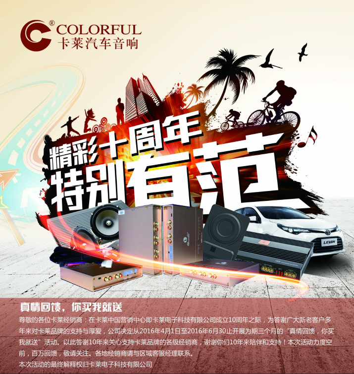 專業汽車音響制造品牌卡萊電子科技有限公司為了慶祝10年來品牌文化和傳承與延續,以及答謝廣大新老客戶多年來對卡萊品牌的支持與厚愛,將于4月1日至6月30日止在全國開展為期三個月的“真情回饋,你買我就送”活動??ㄈR將汽車后市場最具代表性的產品再度轟擊人們的聽覺中!極高的穩定性、優良的性價比可謂是為汽車音響升級量身打造!