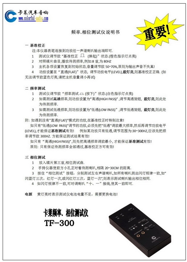 如只有”低通(LOW PASS)”調節的功放,必須先把”低通”調致最大頻率,然后再調節功放電平(LEVEL),才能保證基準測試有效! 例如某功放只有低通,調節范圍為:30~300HZ,應該先把頻率調節致300HZ. 方能保證測試結果有效!