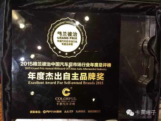 2016年,九州深圳展會開幕之際,卡萊電子科技憑借2015年在中國市場的杰出表現,逆勢高速增長的態勢,獲得2015格蘭彼治中國汽車后市場年度總評榜之“年度杰出自主品牌獎”。